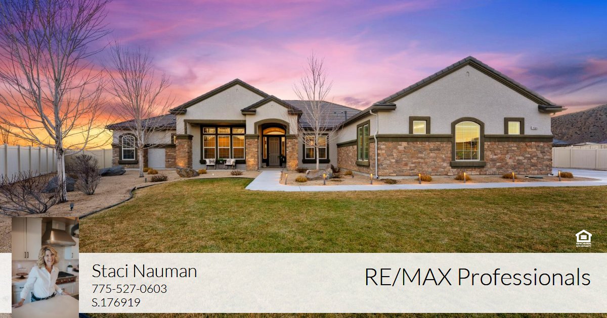 Located in the highly desirable Pebble Creek community and built in 2018, this exceptional single-story estate sits on 1.38 acres — one of the largest lots in the neighborhood — offering rare privacy, space, and sweeping mountain views. The home features 3,244 sq ft, 5 bedrooms, 3 bathrooms, and a 3-car garage—delivering modern luxury on a grand scale. Inside, the home is filled with natural light and features engineered hard-wood flooring, granite countertops, upgraded fixtures, and a spacious open-concept design ideal for both everyday living and upscale entertaining. The chef's kitchen anchors the home with a large island, abundant workspace, and seamless connection to the great room and dining area. The separate living room currently serves as a game room, and the pool table with accessories is included. The private primary suite is a true retreat complete with a sitting area, custom walk-in closet and spa-like bath. The additional bedrooms are generously sized, offering flexibility for guests, office space, or multigenerational living. The insulated 3-car garage is equipped for enthusiasts and hobbyists alike, featuring a gear wall storage system, utility sink, 50,000 BTU heater, and EV charging receptacle. With 400-amp electrical service and a 100-amp stub-out, the property is primed for a future RV garage, workshop, or casita. Step outside to a resort-style backyard designed to capture the panoramic mountain setting. Enjoy an outdoor kitchen with built-in BBQ, granite counters, refrigerator, gas fire pit, hot tub, and powered gazebo, creating an ideal space for entertaining or relaxing under the Nevada sky. A rare combination of newer construction, privacy, upscale finishes, and usable acreage — this is Northern Nevada living at its finest.